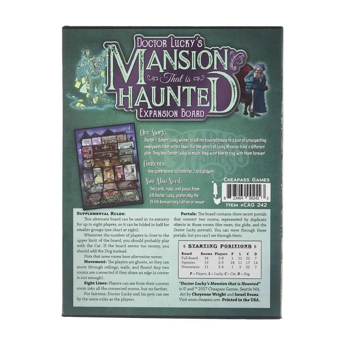 Experience a ghostly twist in Kill Doctor Lucky with the Doctor Lucky’s Mansion That Is Haunted expansion board! Play as mischievous spirits and navigate through ceilings, walls, and floors, as any two connected rooms become your ethereal playground. Unravel the secrets of three hidden portals and outwit your opponents in this hauntingly fun game. With foldable options for different player counts, up to 8 players can join in the spectral festivities. Don’t miss the chance to add this expansion to your collection and unleash your supernatural powers!