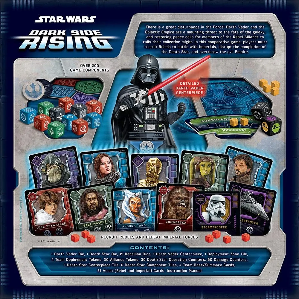 In Star Wars: Dark Side Rising, embark on a thrilling adventure set in the Star Wars universe. Join forces with iconic characters like Luke Skywalker, Princess Leia, and Han Solo to recruit rebels, strategize against the Empire, and thwart the construction of the Death Star. This co-operative card and dice game offers intense gameplay, where you must coordinate efforts, make critical decisions, and race against time to restore freedom to the galaxy. With stunning components, including a custom-sculpted Darth Vader centerpiece, immerse yourself in the Star Wars saga and experience the thrill of the ultimate battle between the light and dark sides of the Force!